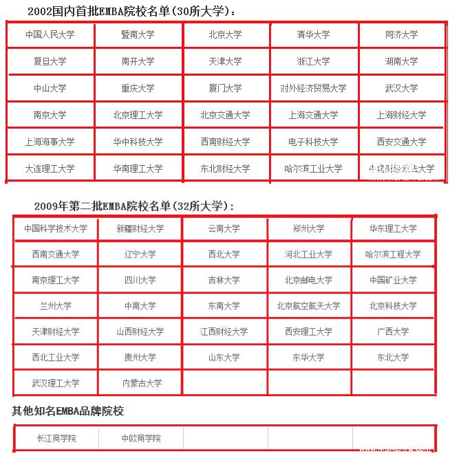 每年我國(guó)EMBA招生院校都在陸續(xù)增加,此處以第一批,第二批全國(guó)開(kāi)始招生的統(tǒng)計(jì)名單為例: