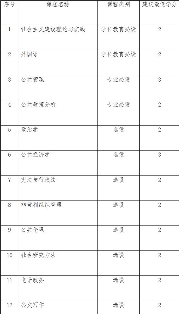 1.核心課是學(xué)生必修課程。“核心課程目錄”共列12門課,其中,“社會主義建設(shè)理論與實踐”和“外國語”為學(xué)位教育必設(shè)課程;“公共管理”和“公共政策分析”是本專業(yè)必設(shè)核心課程;其他核心課程,由各培養(yǎng)院校從“核心課程目錄”中選擇開設(shè)。