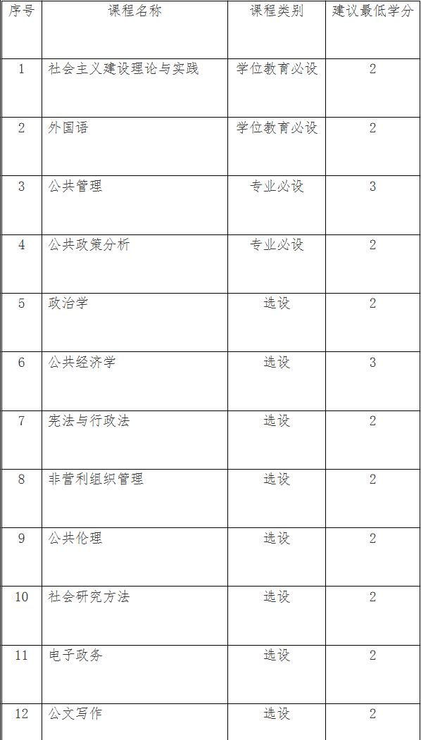 (2)“核心課程目錄”共列12門課,12門課的建議最低學(xué)分共26學(xué)分。其中,“社會主義建設(shè)理論與實踐”和“外國語”為學(xué)位教育必設(shè)課程。“公共管理”和“公共政策分析”是本專業(yè)必設(shè)核心課程,其他核心課程,由各培養(yǎng)院校從“核心課程目錄”中選擇開設(shè)。